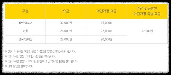 아래와 같이 결제 요금이 나와있지만 아이들의 경우 좀 더 할인해 주는 혜택들이 현장에 게시되어 있거나 홈페이지에서 확인 가능하니 할인 혜택을 놓치지 않길 바랍니다.
