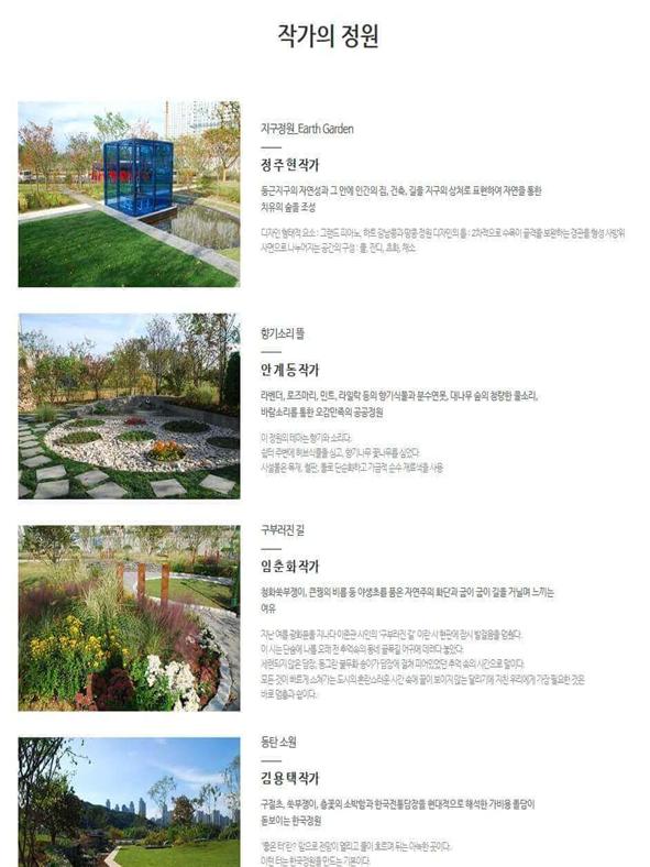 이 공원은 아는 분들이라면 알고 모르시는 분들도 있을 텐데요. 여기는 작가의 정원이라고 하여 여러 작가님들이 꾸며놓은 정원들은 한 곳에 모아두어 산책하며 보는 재미가 있는 곳입니다. 사람들에게 많이 알려지지 않았지만 음악분수도 가동한다고 하니 시간에 맞춰 가보시길 추천드립니다.
